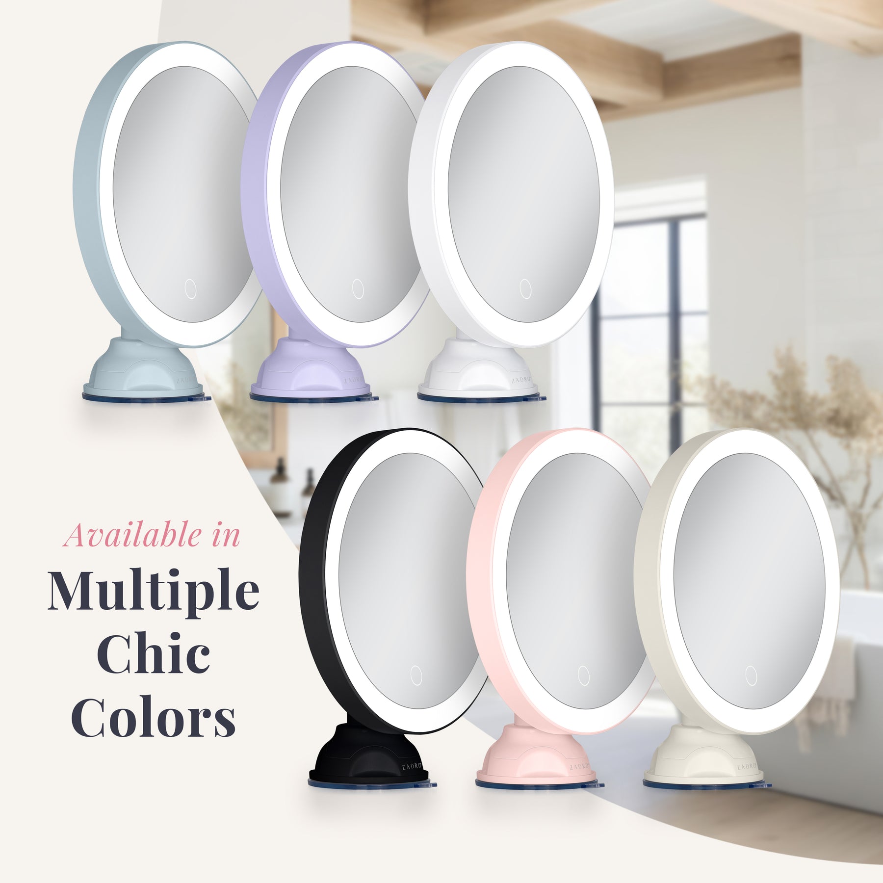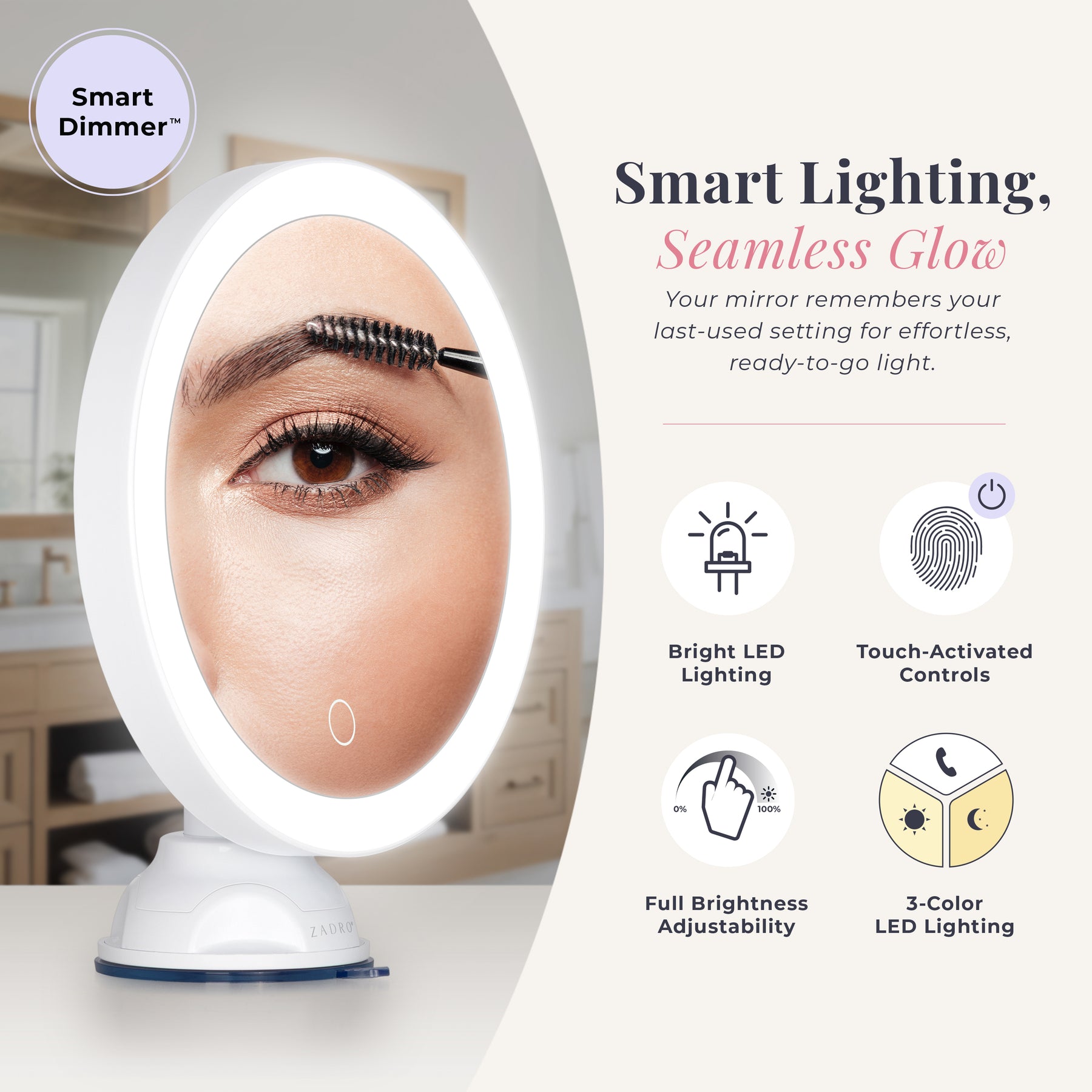 Powerful magnification meets flexible, go-anywhere design. Optical quality 10X magnification reveals precise detail for liner, lashes, and grooming, while a full ring of LEDs offers Warm, Daylight, or Cool illumination with touch control dimming for a natural, makeup true reflection. The custom positioning swivel glides smoothly to any angle and the power suction base secures to smooth, non-porous surfaces so your space stays clear. Cordless battery power makes travel and placement simple on mirrors, tile, glass, or a vanity surface. Batteries not included.