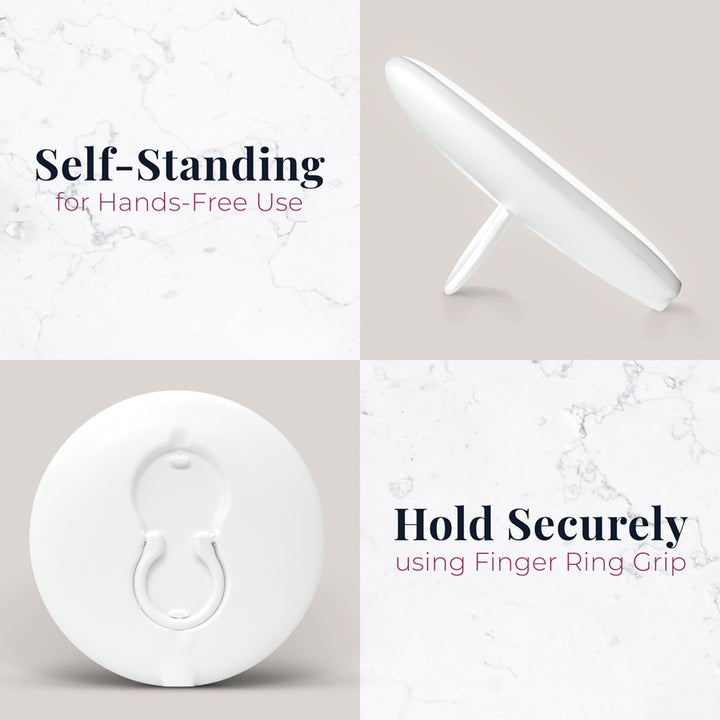 highlightconvenient finger ring grip in back of mirror to securely hold in your hand or use as a stand for hands-free use